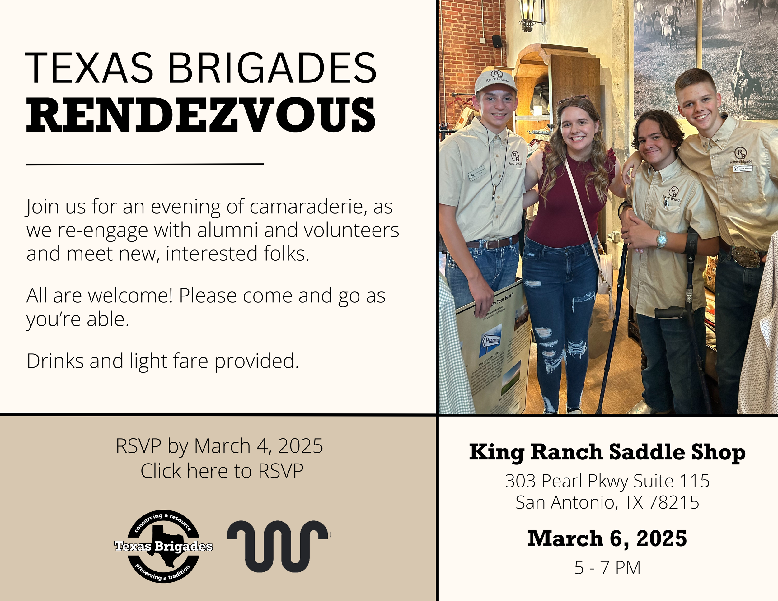 We’re excited to invite you to a casual gathering of the Texas Brigades Family in San Antonio! This is a fantastic opportunity to reconnect with old friends, meet new faces, and see firsthand how the Brigade camp model continues to shape the next generation of conservation leaders.