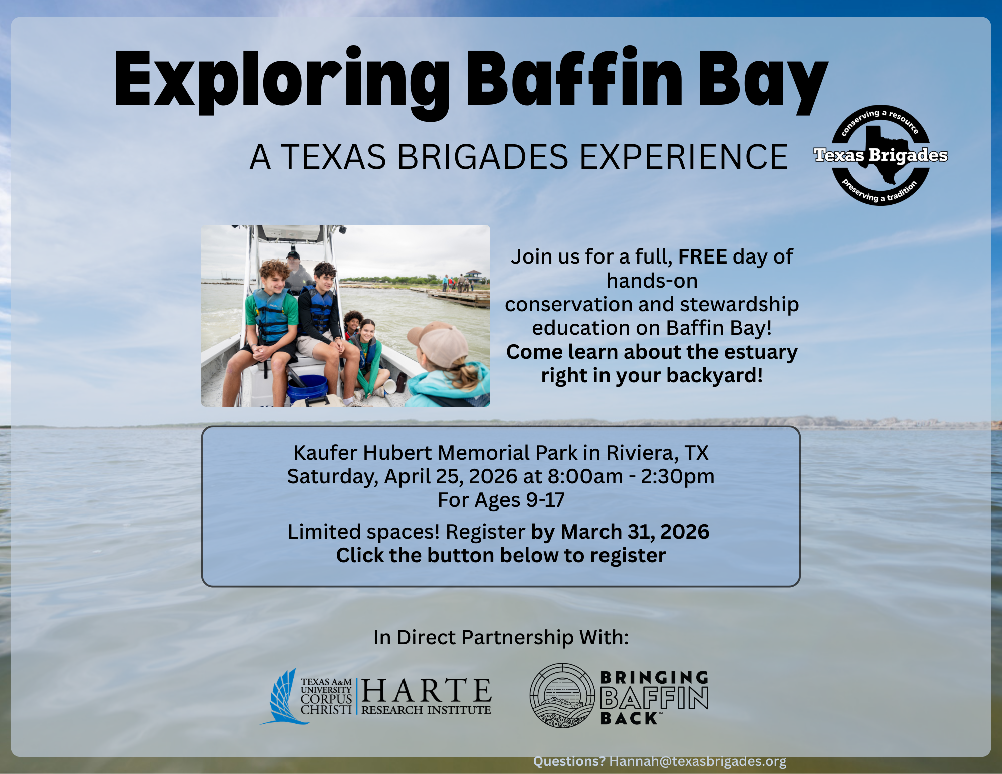 This Experience will offer fun, hands-on conservation and stewardship activities at Baffin Bay! Activities will address topics including boating, fishing, water quality testing, fish identification, bird identification, watershed systems, and more!